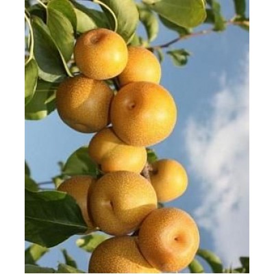 Колоновидный сорт груши “Хосуи” - это особый сорт, интересное сочетание груши и яблока в одном фрукте. Дерево, пирамидальной формы с большими гладкими листьями, оригинально смотрится на участке.